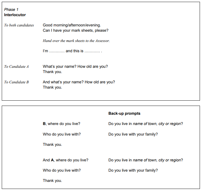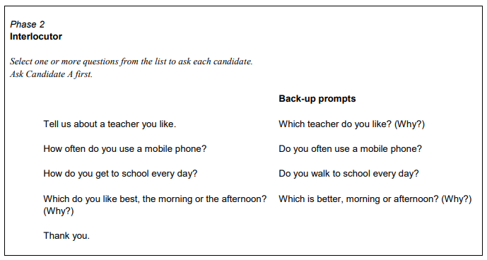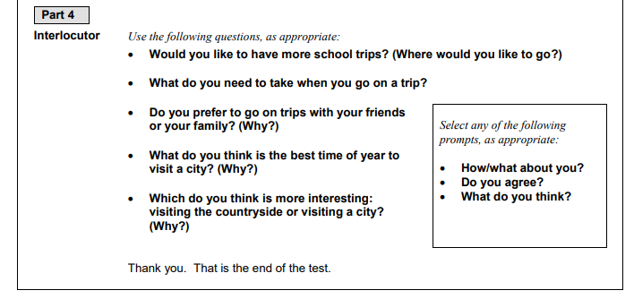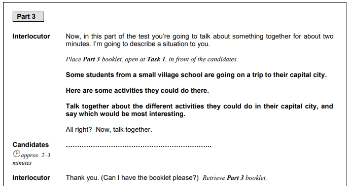 What happens: the interlocutor asks the candidates a series of questions which are related to the theme of part 3. These questions may be directed to an individual candidate or to both, allowing for a natural conversation to establish between the two.